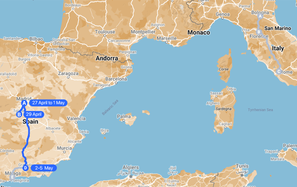 We bid farewell to the bustling streets of Madrid and set off for Granada by train. Our Uber ride to the train station was convenient. The Renfe train journey itself took about 4.5 hours, costing €78 per person, with a connection in Córdoba where we switched trains for Granada.
